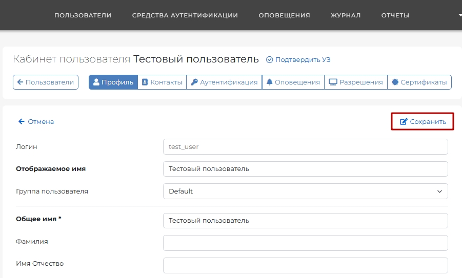 После завершения редактирования атрибутов Пользователя следует нажать кнопку «Сохранить» для сохранения изменений.