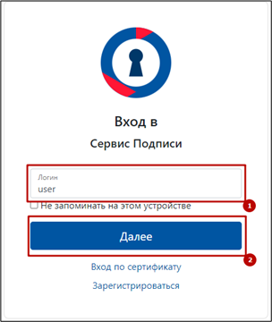 В случае, если Оператором (или Пользователем) был выбран метод первичной аутентификации «Аутентификация по паролю», для аутентификации необходимо ввести имя учётной записи (логин) в поле ввода и нажать кнопку «Далее»