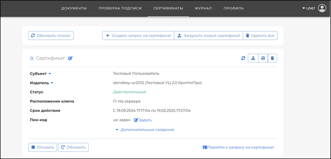 В зависимости от настроек, Пользователю может потребоваться ввести ПИН-код доступа к ключевому контейнеру, и затем нажать кнопку «ОК». Если Оператором включено требование подтверждения операции входа в веб-интерфейс при помощи метода вторичной аутентификации, то Пользователь должен подтвердить операцию входа соответствующим методом вторичной аутентификации.