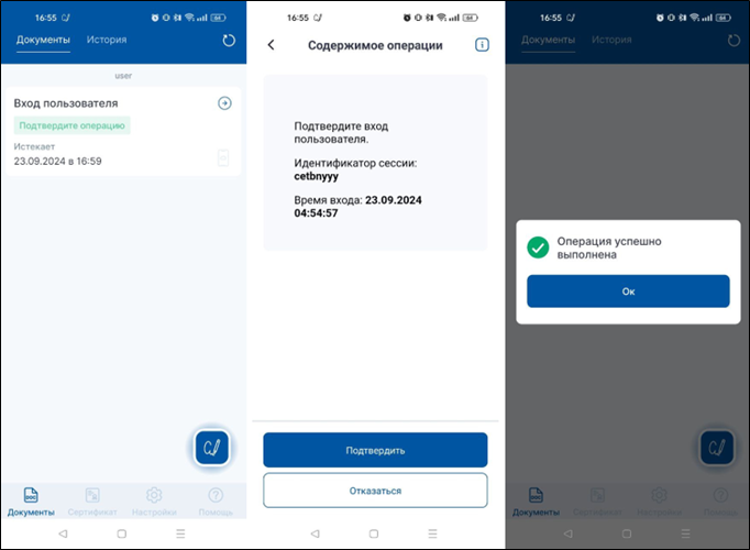 Подтверждение операции происходит в мобильном приложении «DSS Client» или Криптопро Ключ.