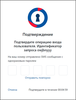 В случае запроса вторичной аутентификации по SMS/протоколу OATH/электронной почте Пользователь должен ввести в поле ввода запроса подтверждения операции код подтверждения, полученный в сообщении SMS/одноразовый пароль, сгенерированный токеном OTP/код подтверждения, полученный в сообщении электронной почты.