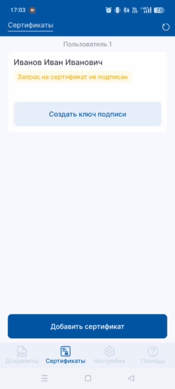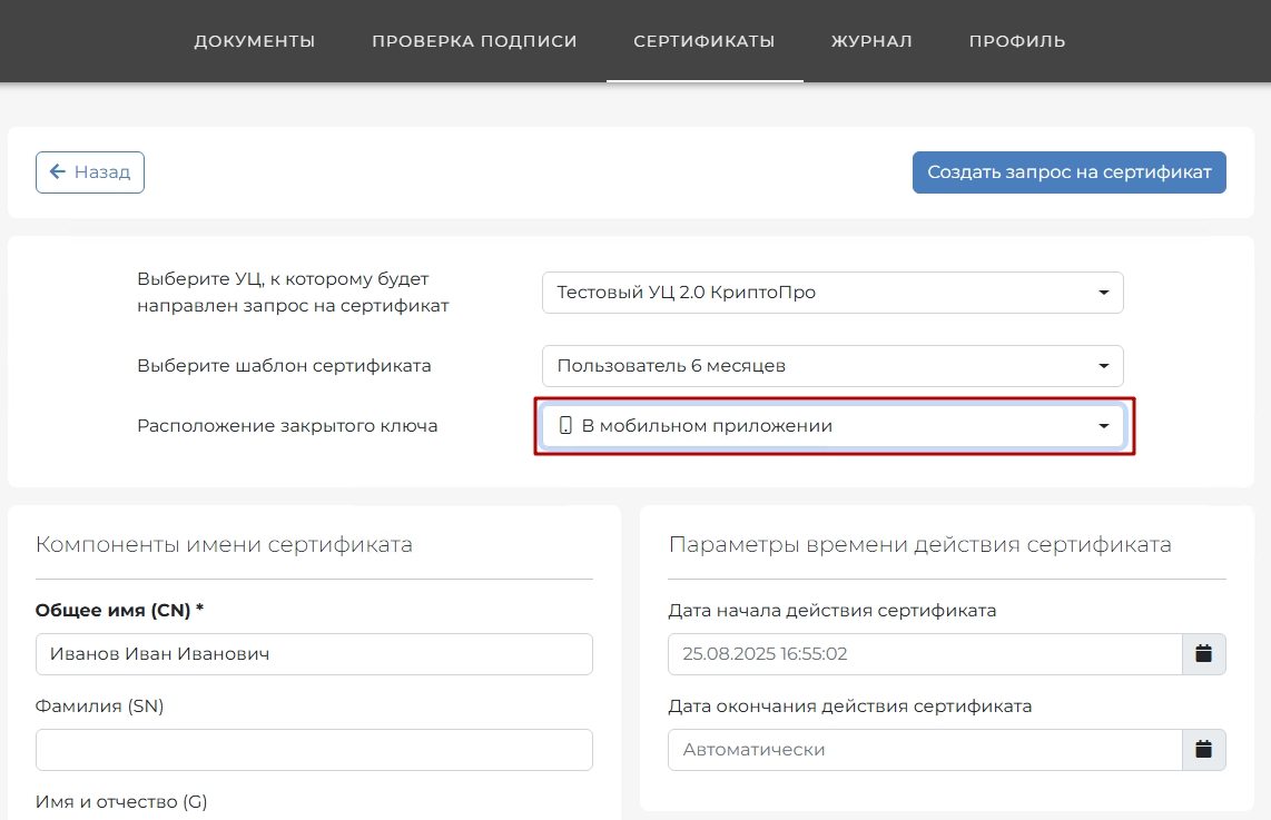 Создание запроса на сертификат с автоматическим выпуском сертификата в Тестовом УЦ с хранением ключей в мобильном приложении
