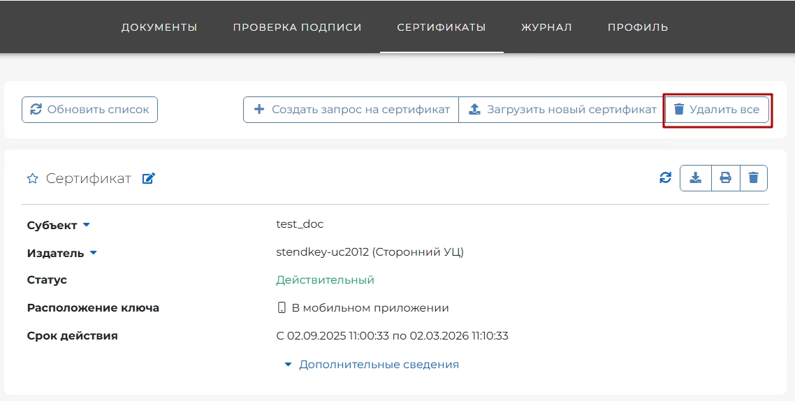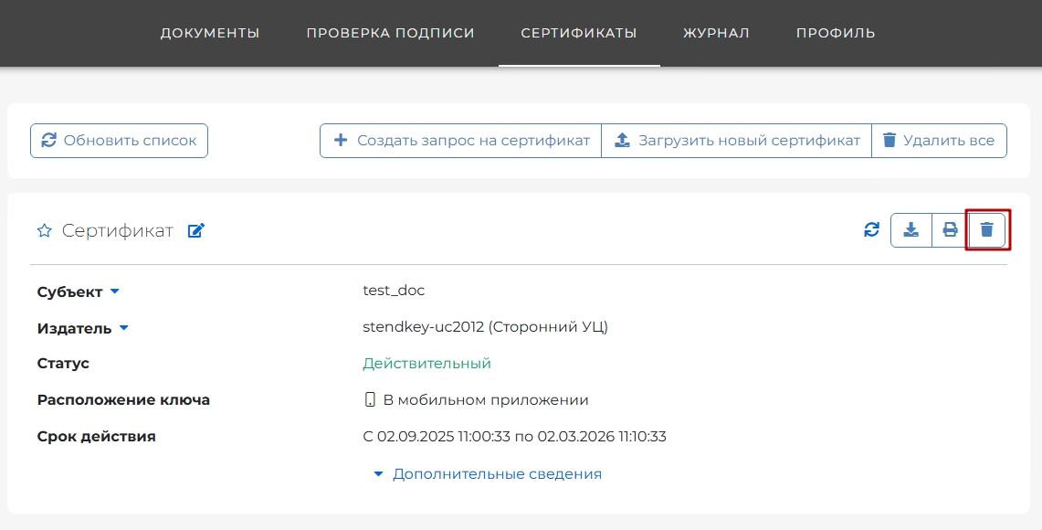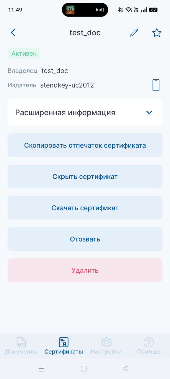 Удаление сертификатов через мобильное приложение