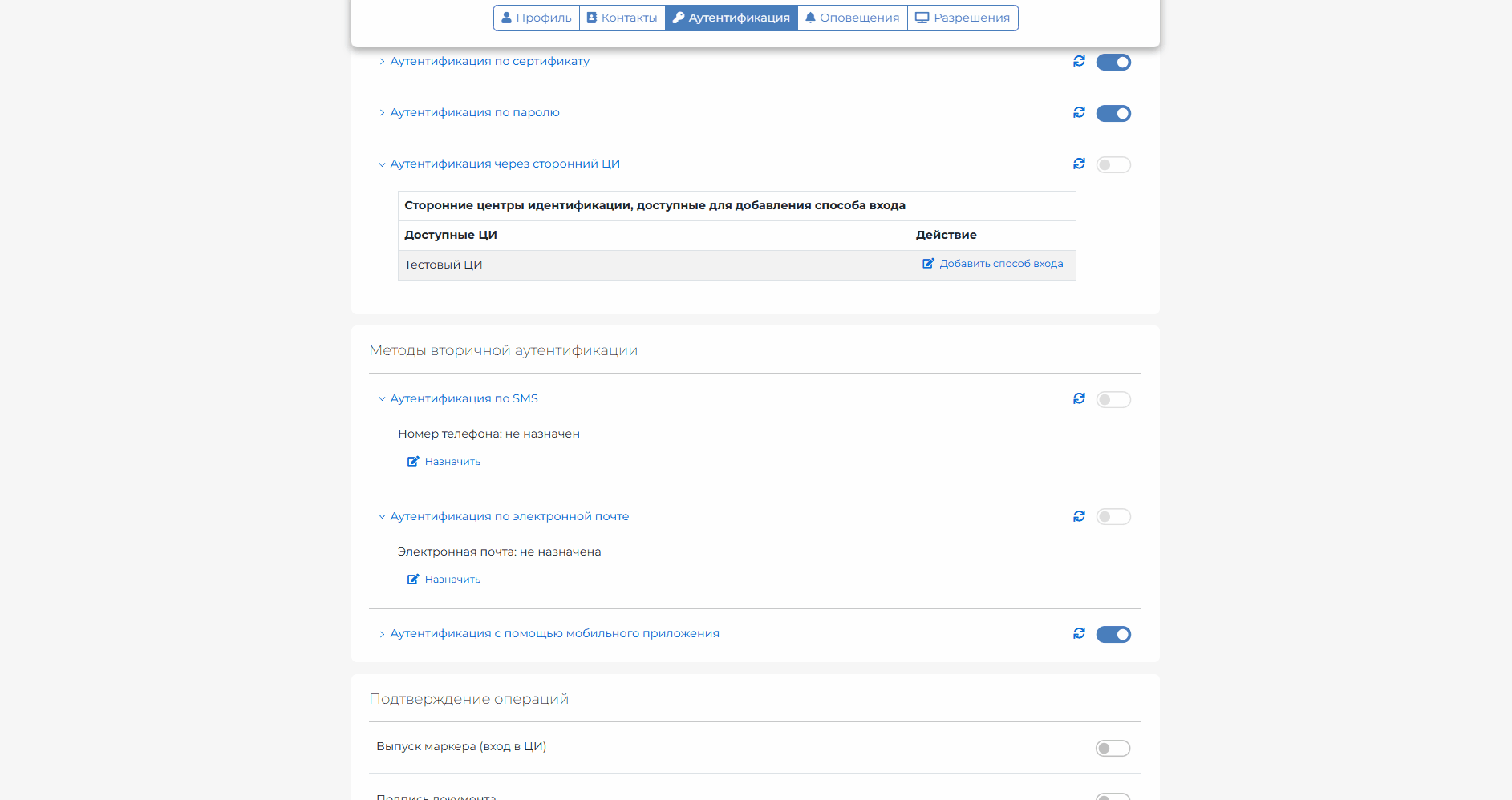 Для включения вторичной аутентификации по SMS необходимо установить переключатель «Аутентификация по SMS» в группе «Вторичная аутентификация» в активное положение.