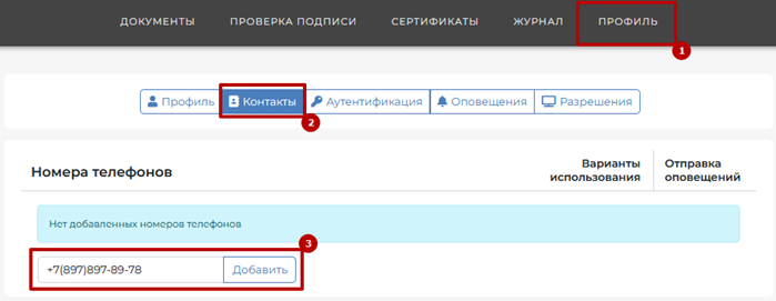 Раздел предназначен для управления контактной информацией пользователя. Для добавления номера телефона нужно открыть «Контакты» и ввести номер телефона в разделе «Номера телефонов» и нажать кнопку «Добавить».